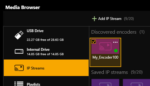• If you want to stream from the internet, or from an encoder that does not appear in Discovered encoders, add the stream. Select IP Streams > Add IP Stream and enter a useful name and the URL of the media stream.