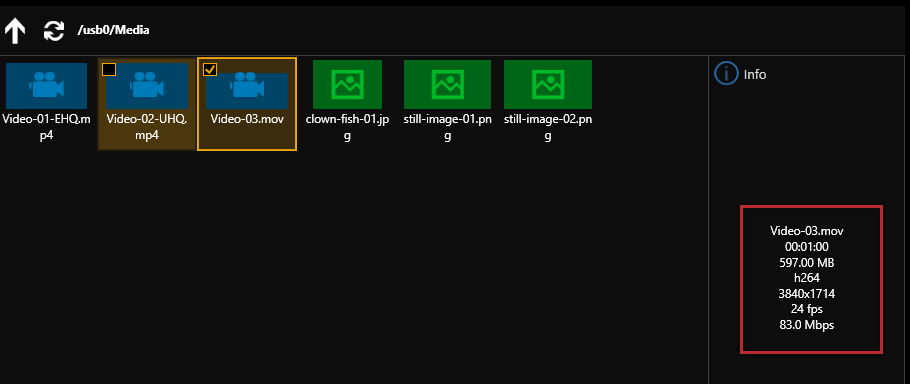 To find the resolution of a media item, select the item in the media browser. Information about that item is displayed on the right.